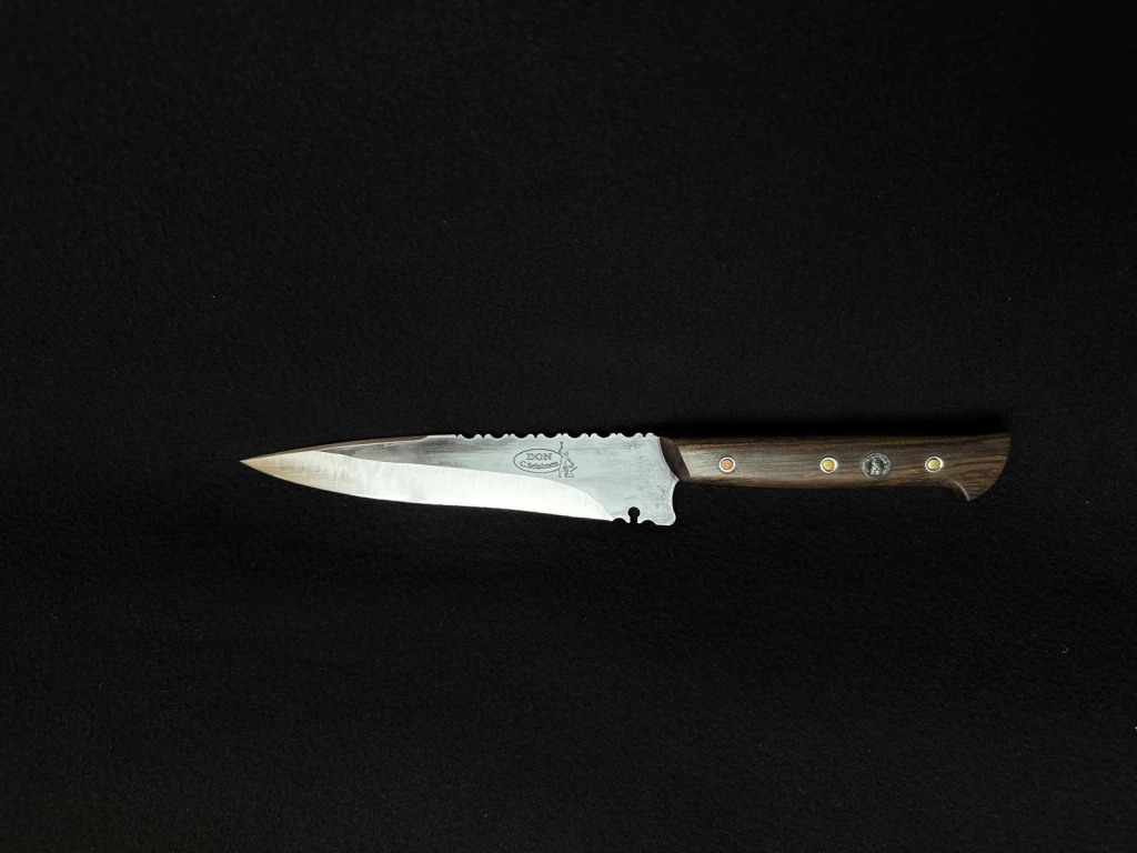 Faca de porte médio para churrasco. Possui desenho exclusivo DCS em forma de lança, silhueta universal e mosqueado caracterísitco até o final do cabo. Muito boa de fio e corte. NOVA marca registrada DCS no corpo da lâmina, sem vazado.
