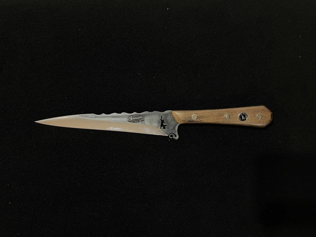 Lindíssima faca de porte médio. Possui desenho de mosqueado exclusivo em forma de lança e nó espanhol diferenciado. Corte fácil e agressivo, boa de manter afiada e pode ser utilizada para cortes grandes e pequenos.