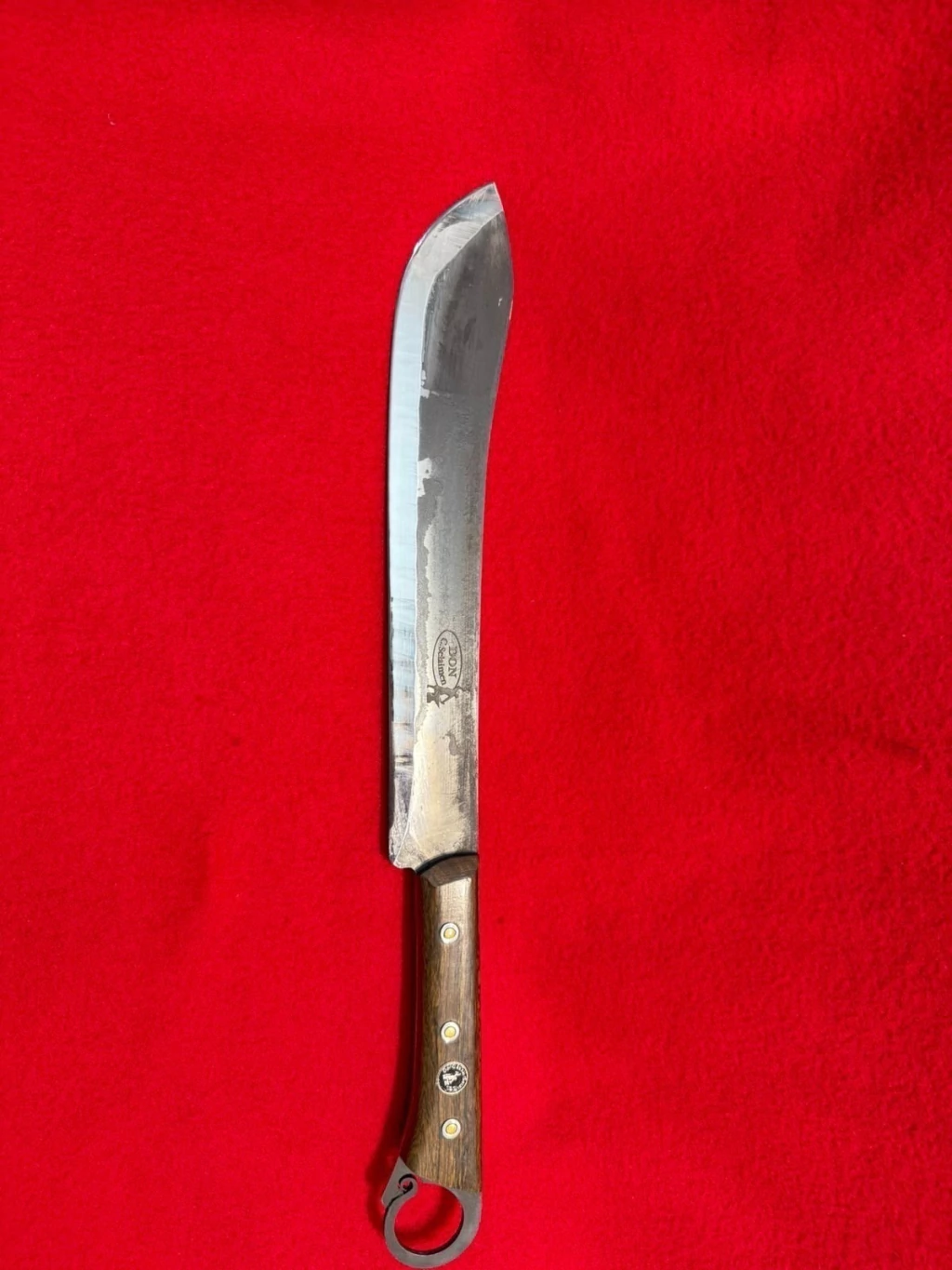 Lindíssima faca de porte médio-grande estilo Butcher/Açougueiro, modelo consagrado mundialmente. Ideal para fatiar e trabalhos de corte contínuo. Possui desenho exclusivo com "ponta" rombuda e argola DCS característica no cabo. Faca com pegada muito ergonômica e de ótimo fio, gerando maior conforto na hora de usar. NOVA marca registrada DCS no corpo da lâmina, sem vazado.