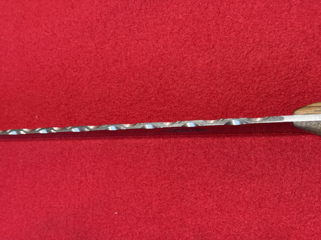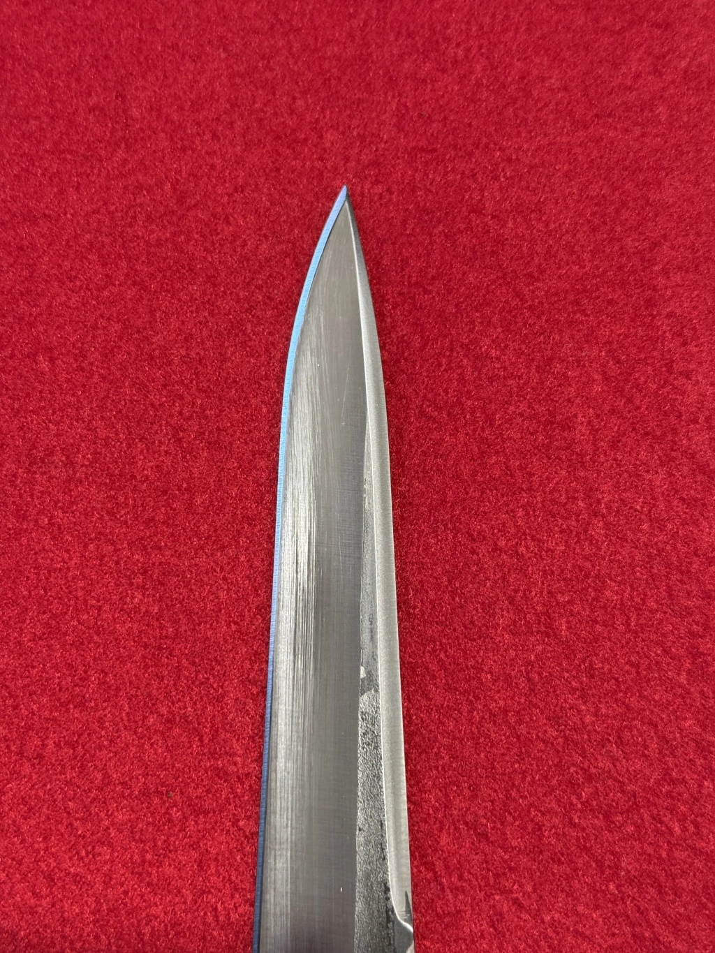 Lindíssima faca de porte grande. Uma língua de chimango! Possui desenho exclusivo com lâmina triangular em formato de lança. Corte fácil e agressivo, boa de manter afiada e com cabo em formato retangular e cantos arredondados. NOVA marca registrada DCS no corpo da lâmina, sem vazado.