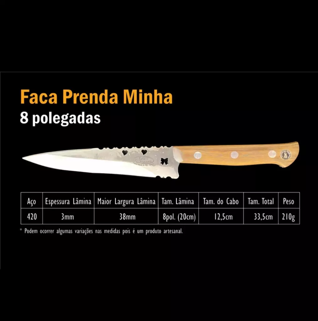 Faca de personalidade forte e beleza singular. Com 8' de lâmina, adornos vazados em formato de corações e laço, e acabamento artesanal lindo, essa peça une estilo, precisão e tradição. Ideal para o uso diário, seja no campo, na cidade, na cozinha ou no churrasco.